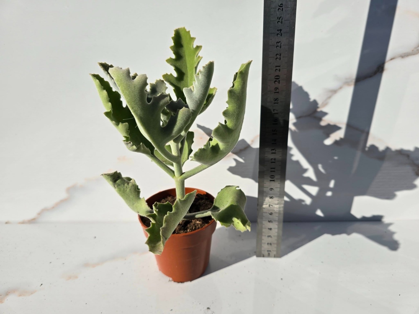 Esta impresionante suculenta, también conocida como «Kalanchoe de orejas de elefante», se caracteriza por sus grandes hojas aterciopeladas de bordes ondulados y color verde grisáceo. Puede alcanzar un gran tamaño con el tiempo.