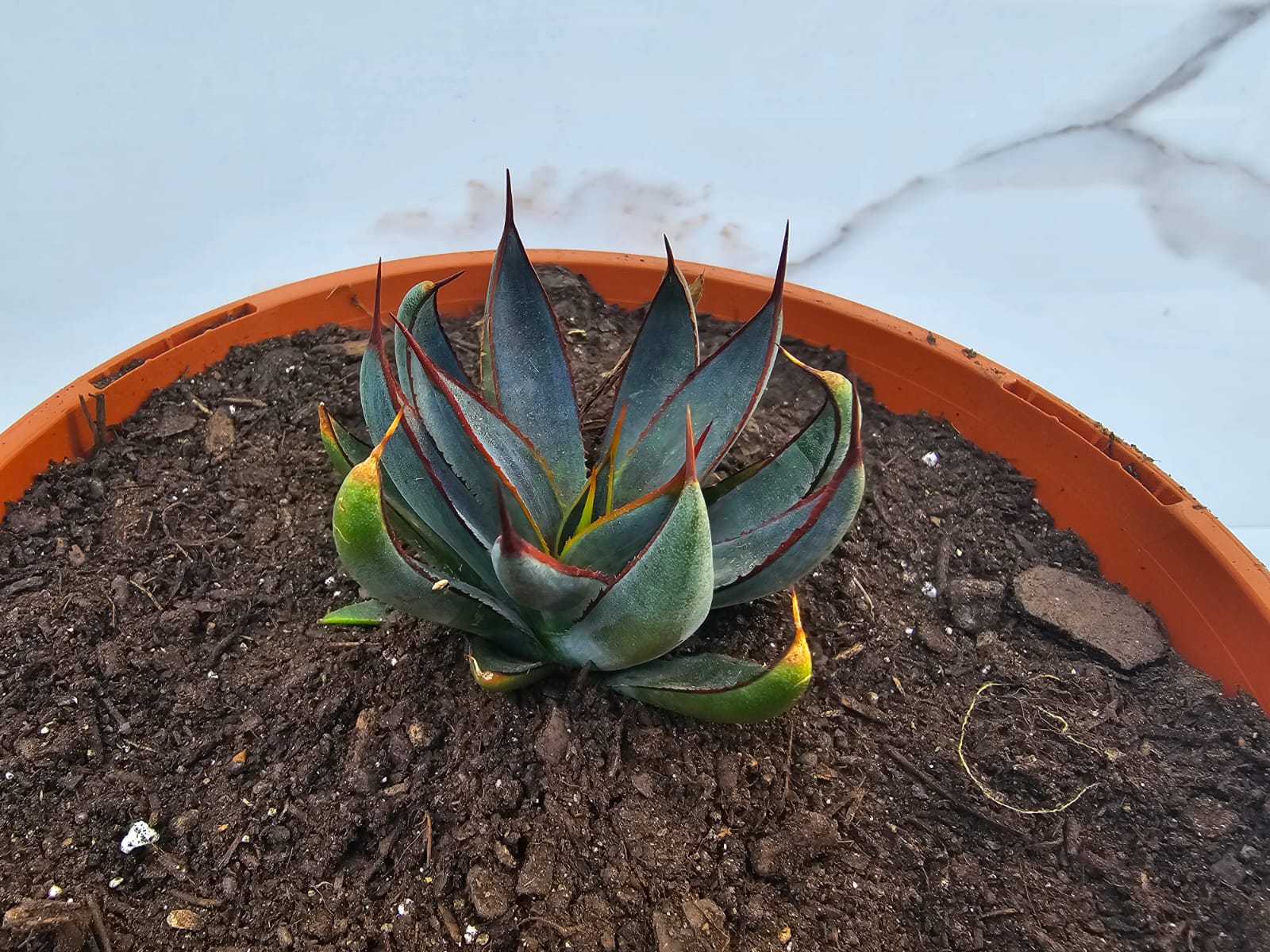 Esta Mangave es un híbrido fascinante con hojas gruesas y alargadas que se pliegan hacia arriba, dándole la apariencia de «manos en oración». Su color es un verde intenso con bordes finos y rojizos, y tiene una textura ligeramente cerosa.