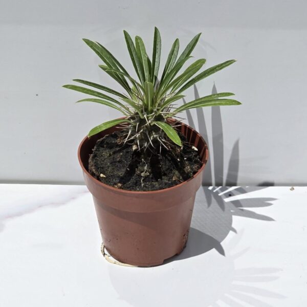 Esta impresionante suculenta de tallo grueso cubierto de espinas y hojas en la parte superior recuerda a una palmera, de ahí su nombre común. Es originaria de Madagascar y puede llegar a crecer varios metros de altura con el tiempo.
