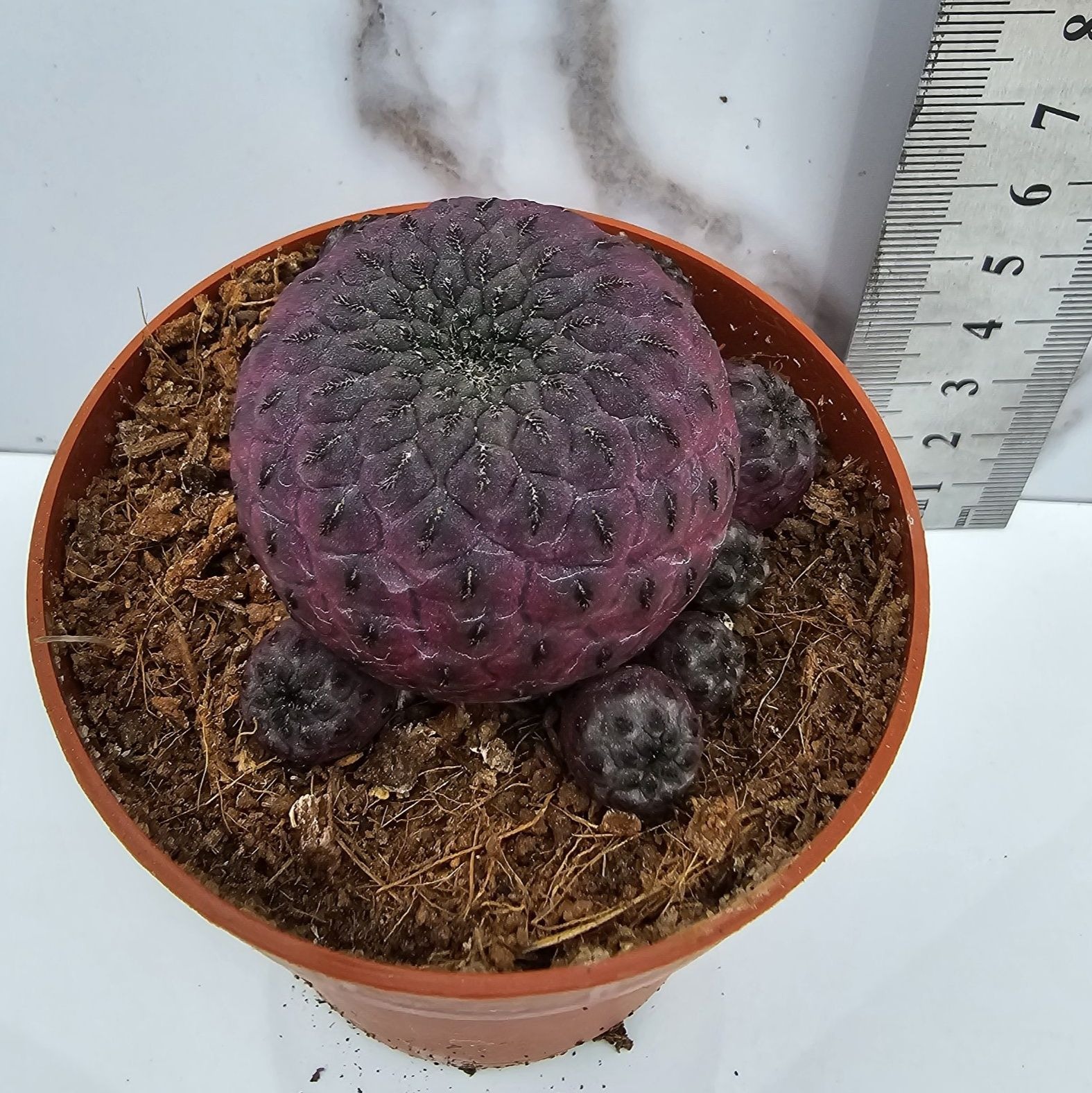 Esta variante de Sulcorebutia rauschii se distingue por su epidermis de tonos púrpura intenso, que se acentúa con la exposición al sol. Sus flores, de color magenta o rosado, aparecen en primavera, creando un contraste espectacular.